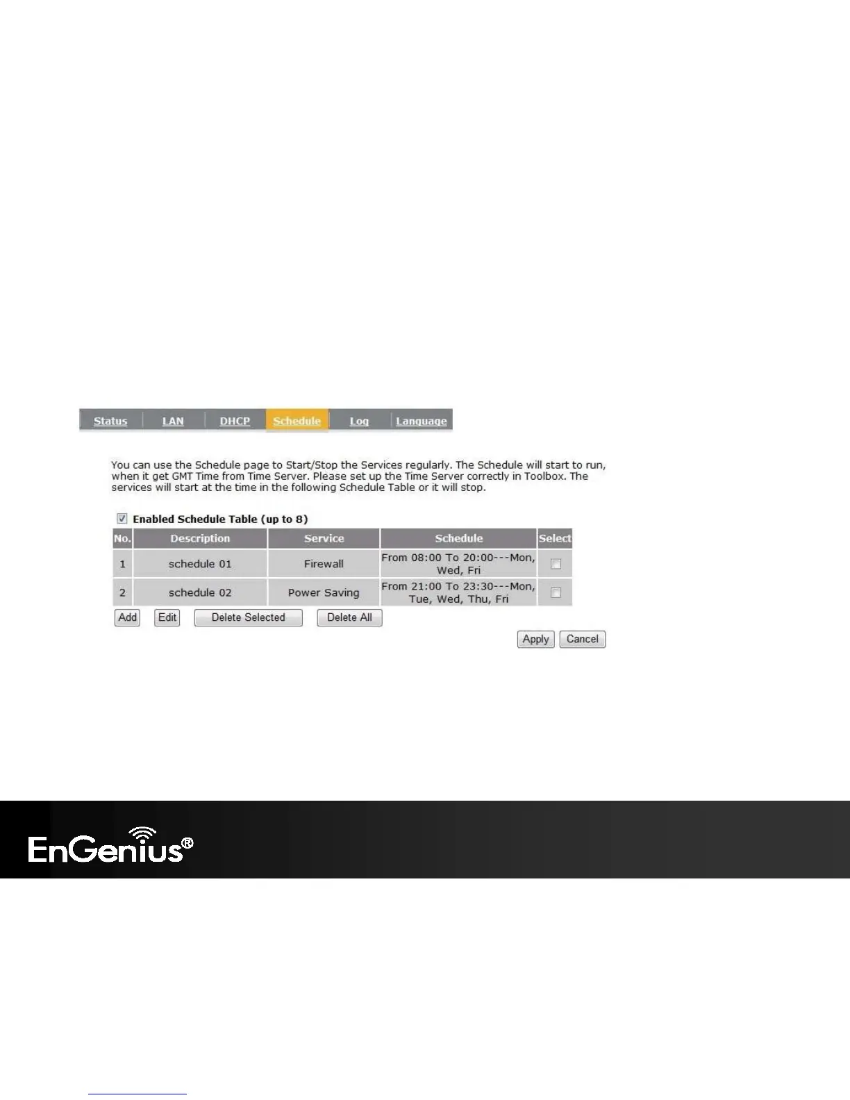This page allows you to setup the schedule times that the Firewall and Power Saving features will be activated /