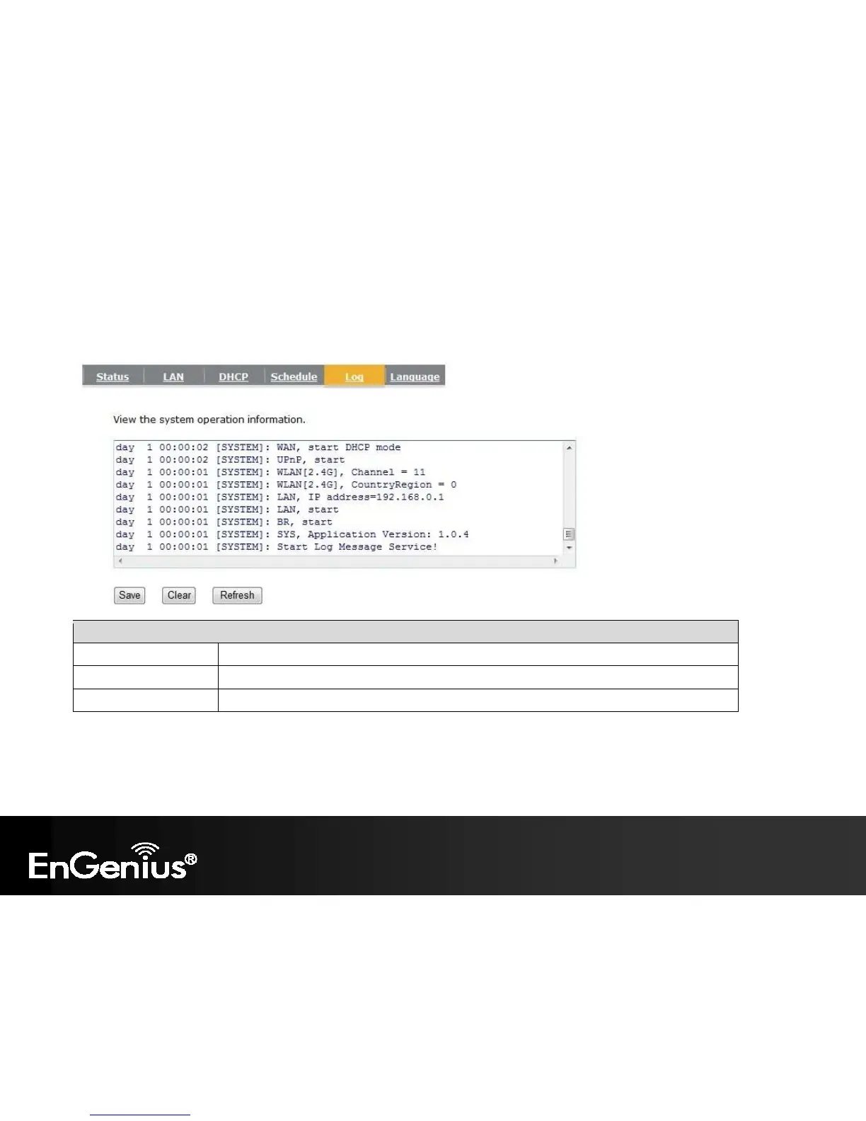 This page displays the system log of the device. When powered down or rebooted, the log will be cleared.