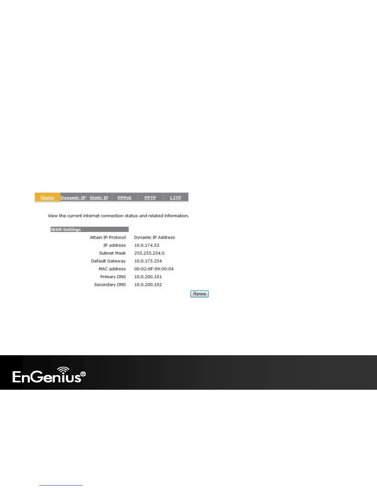 This page shows the current status of the device’s WAN connection.