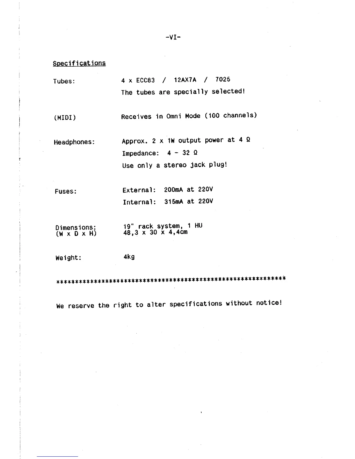 Engl 520 - Technical Specifications; Tube Configuration; MIDI and Headphone Specs; Fuse Ratings, Dimensions, Weight