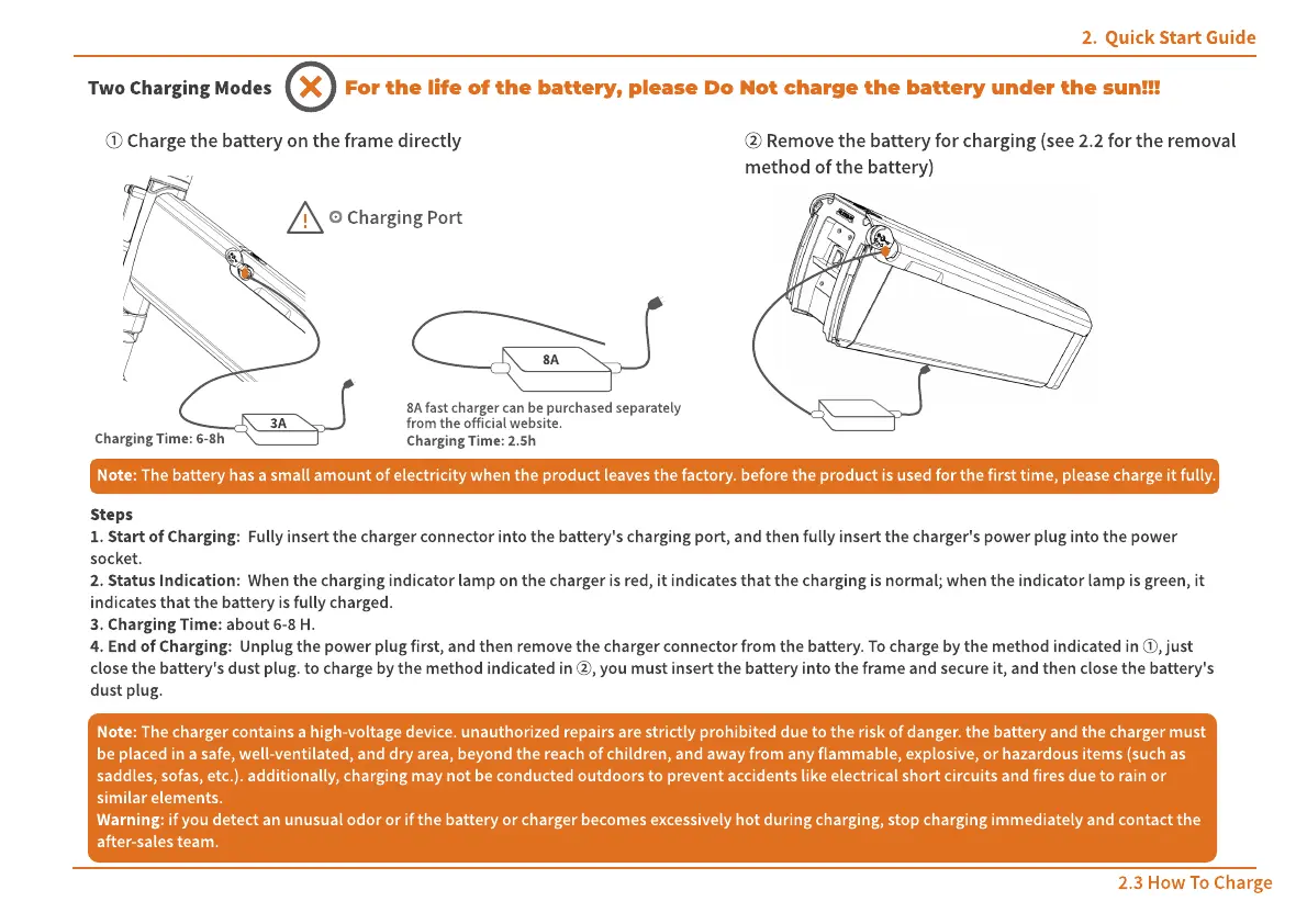 saddles, sofas, etc.). Additionally, charging may not be conducted outdoors to prevent accidents like electrical short circuits and fires due to rain or