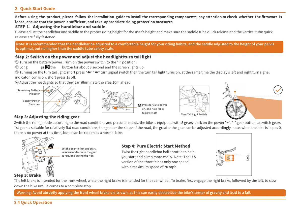 Warning: Avoid abruptly applying the front wheel brake on its own, as this can easily destabilize the bike's center of gravity and lead to a fall.