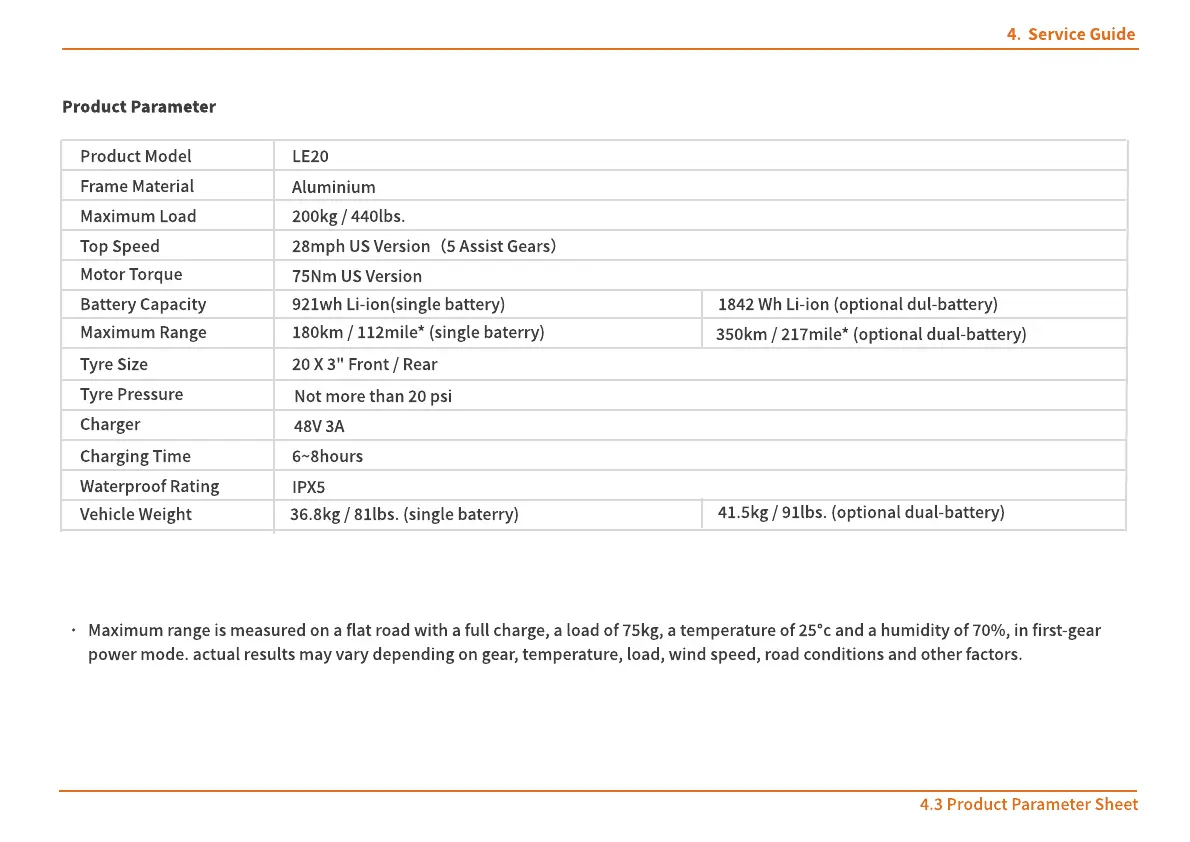 Maximum range is measured on a flat road with a full charge, a load of 75kg, a temperature of 25°C and a humidity of 70%, in first-gear