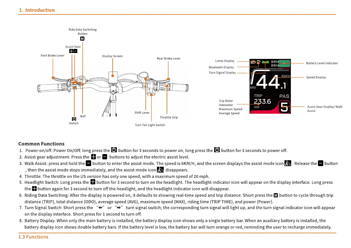 Riding Data Switching: After the display is powered on, it defaults to showing real-time speed and trip distance. Short press the button to cycle through trip