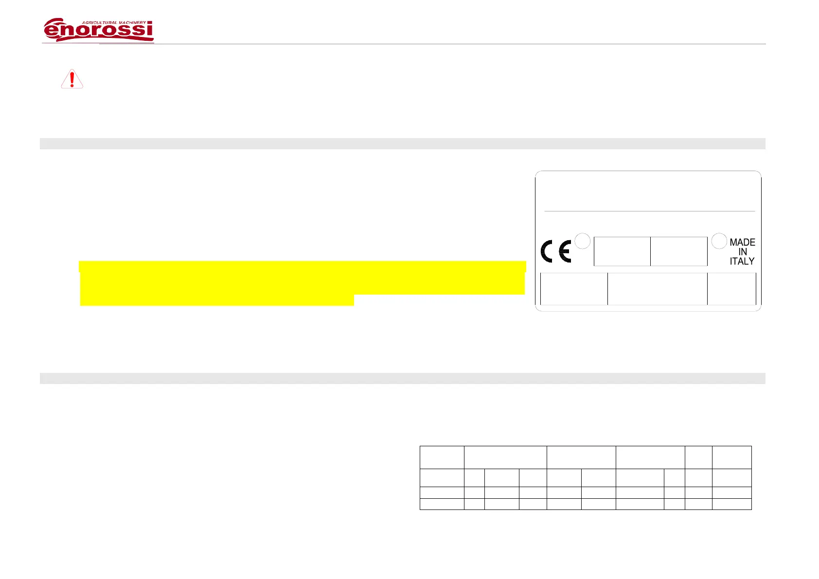 Every equipment is provided with an identification plate applied on the frame and clearly visible, on which the following data is reported: