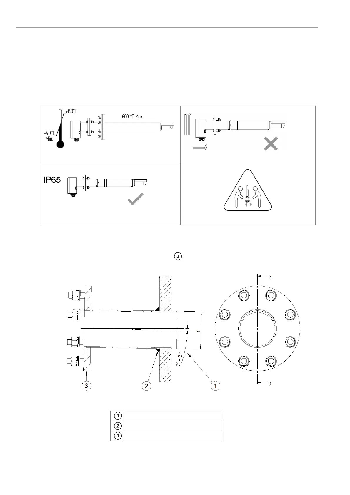 The flange has to be mounted with an angle of 1° to 3° , so that condensed flue gas elements can flow back into