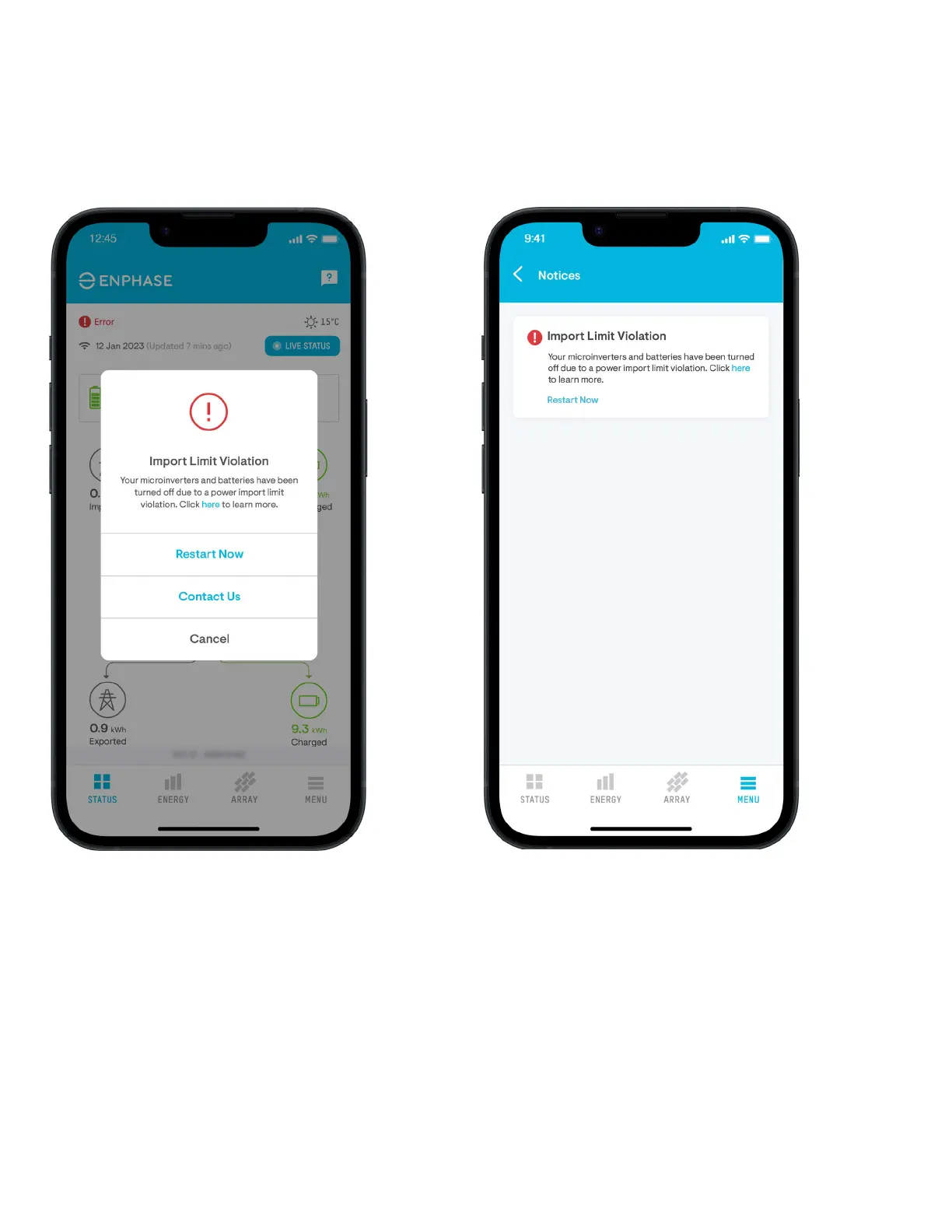 To self-recover the system from a grid import limit violation through the Enphase, click Restart Now.