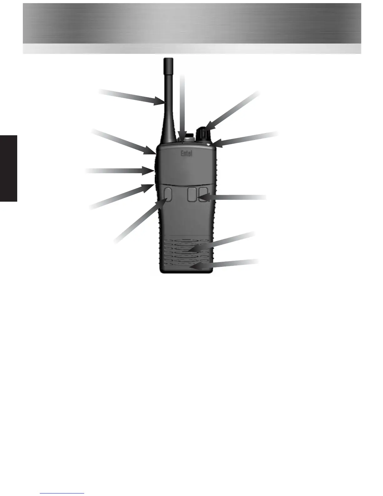 On / Off button. Press to turn radio on, press and hold to turn off.