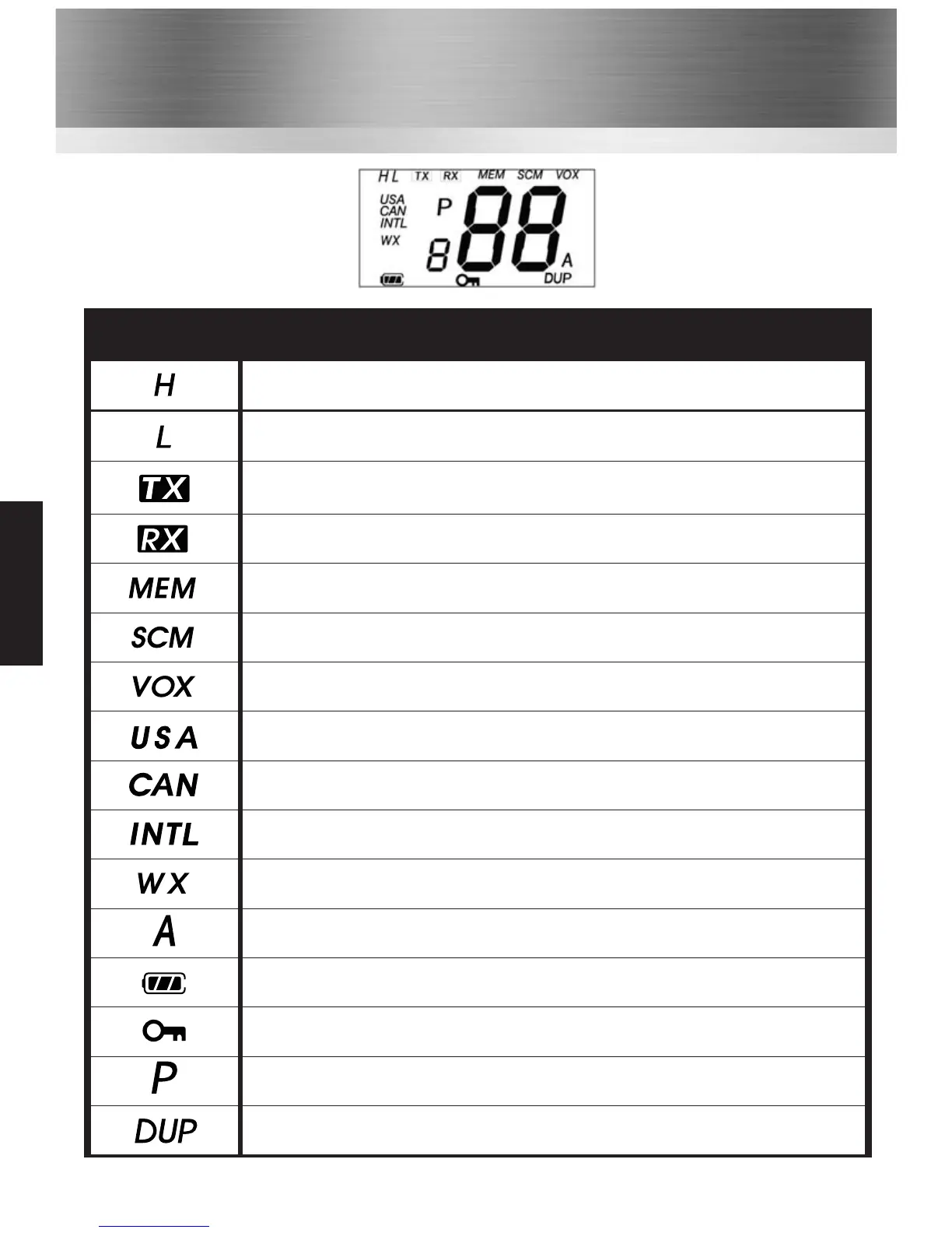 Indicates keypad is locked, excluding the PTT, H/L & LAMP buttons.