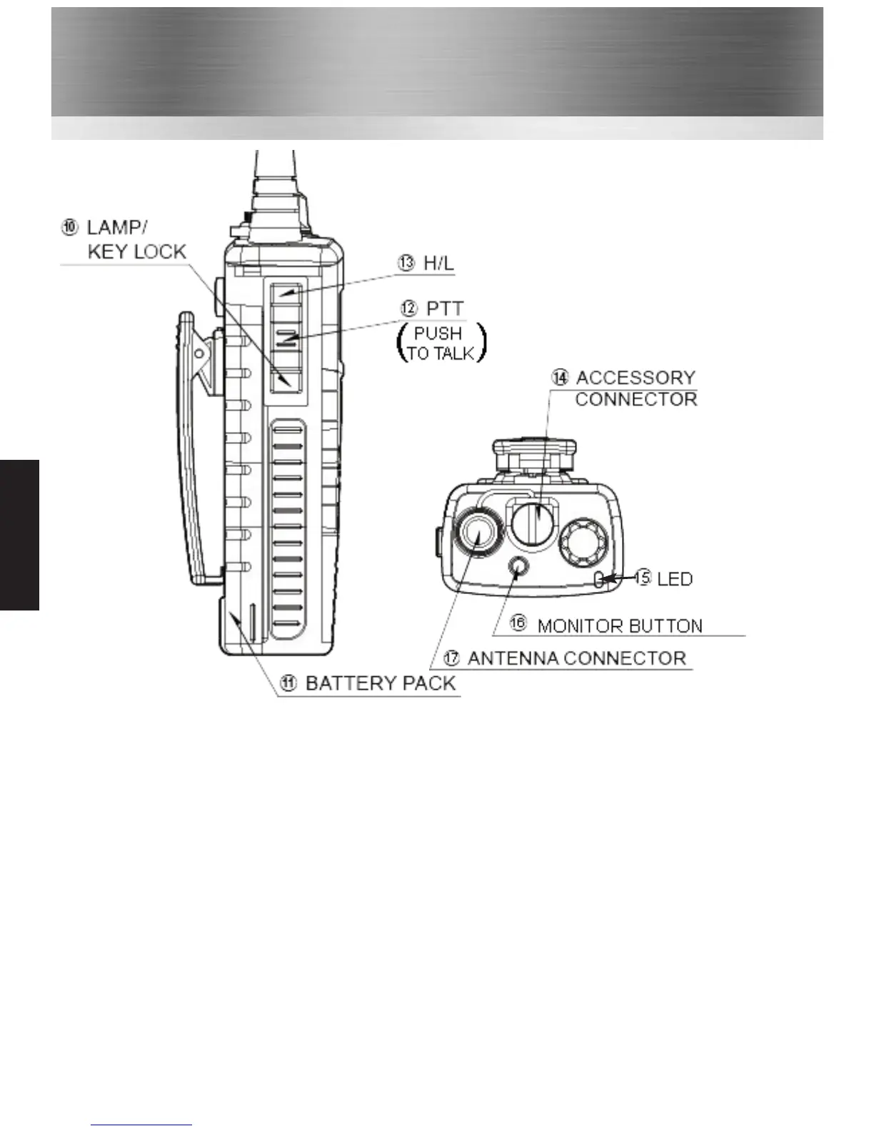 12 PTT (Push To Talk Switch): Hold down to transmit, release to receive.