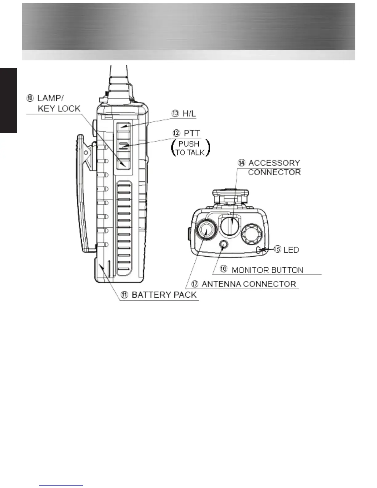 12 PTT (Push To Talk Switch): Hold down to transmit, release to receive.
