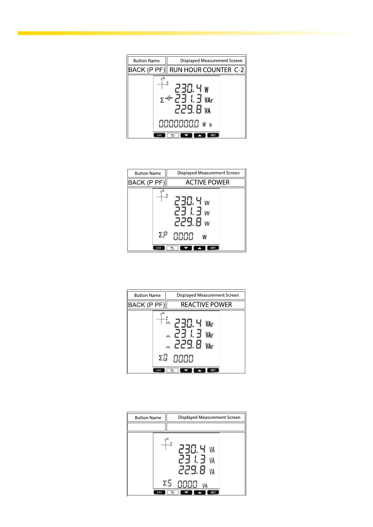 In this screen you can display Active power values for each phases. Sum of all active power values
