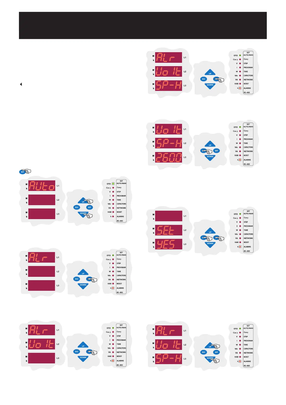 The first setting in the alarm menu(ALr) is the voltage(UoLt). Press the