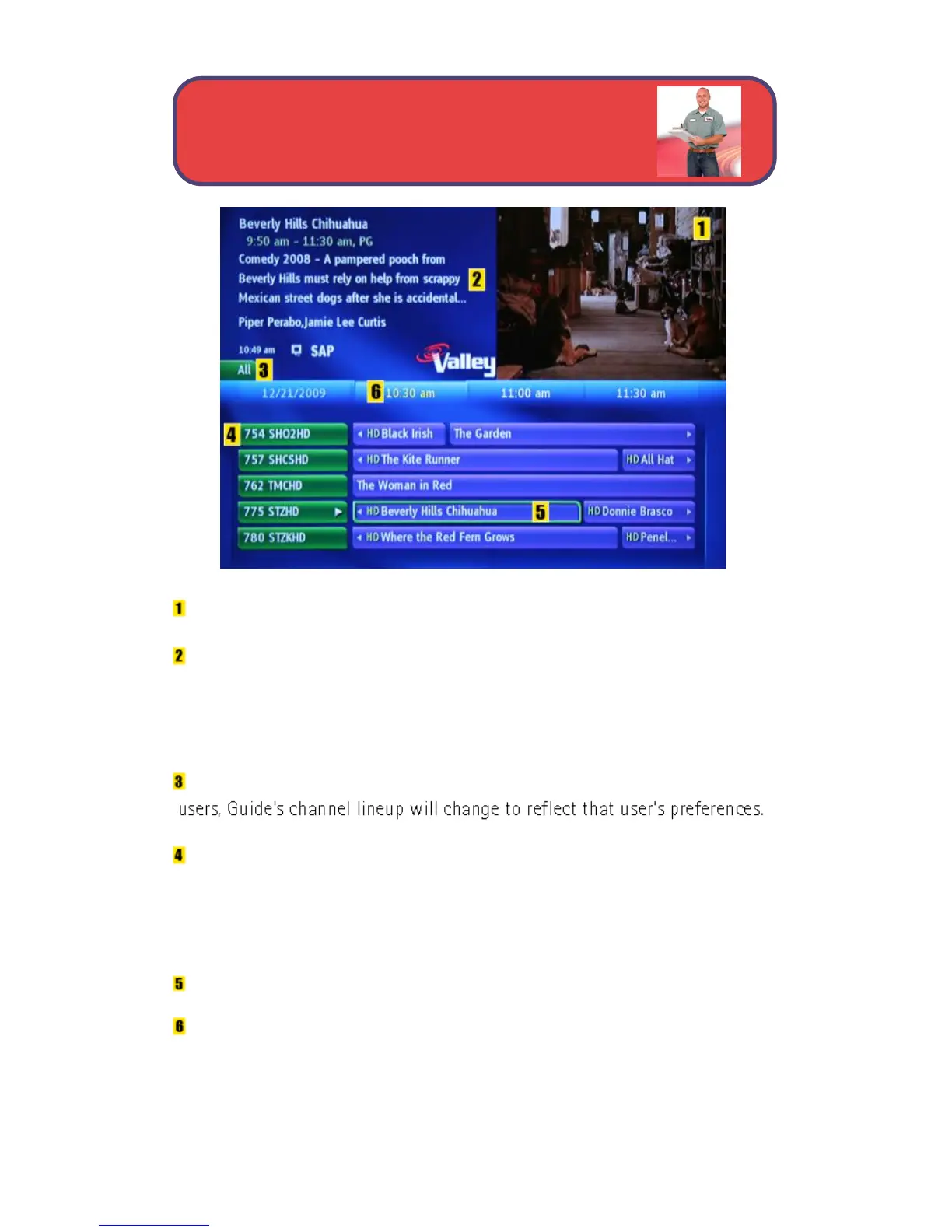 Program Listings Shows channel number and abbreviation (currently
