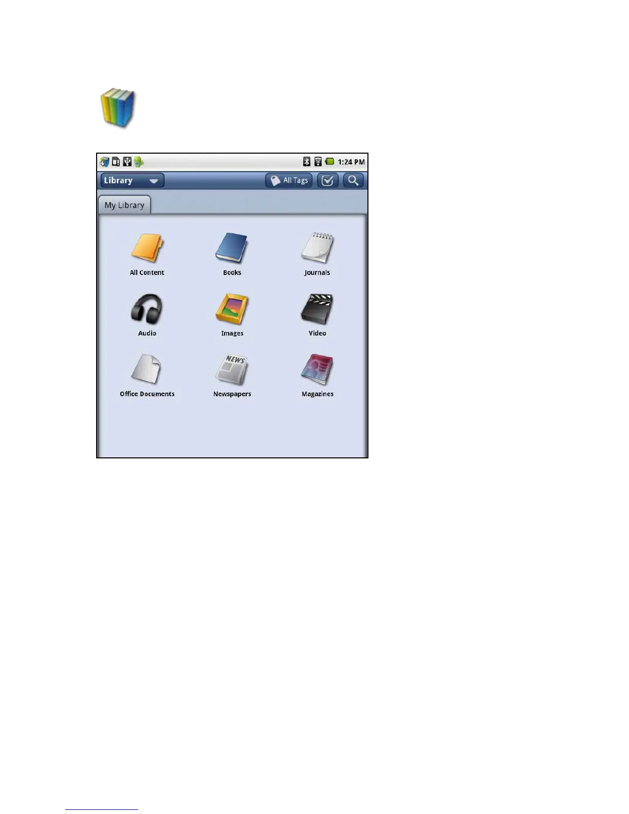 On the tablet, press the Library icon to view your books, music, or pictures.
