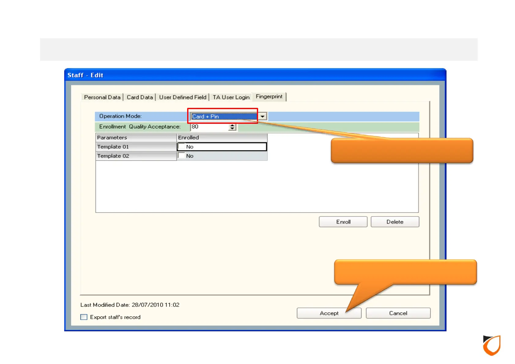 1. Select ‘Card + Pin’ mode