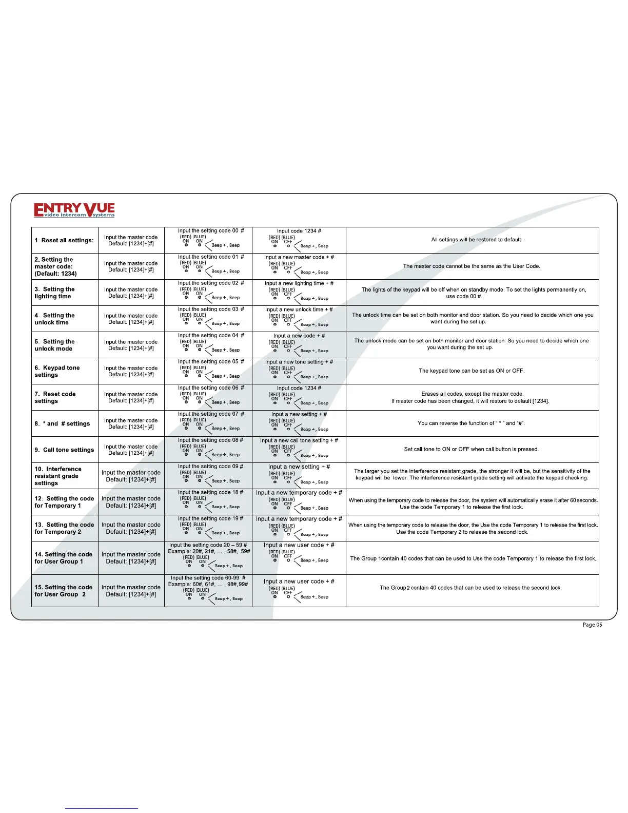 Entryvue VD-950 - Detailed Setting Procedures; Master Code and System Reset Procedures; Time, Unlock, and Tone Configuration Steps; Interference and Call Tone Settings