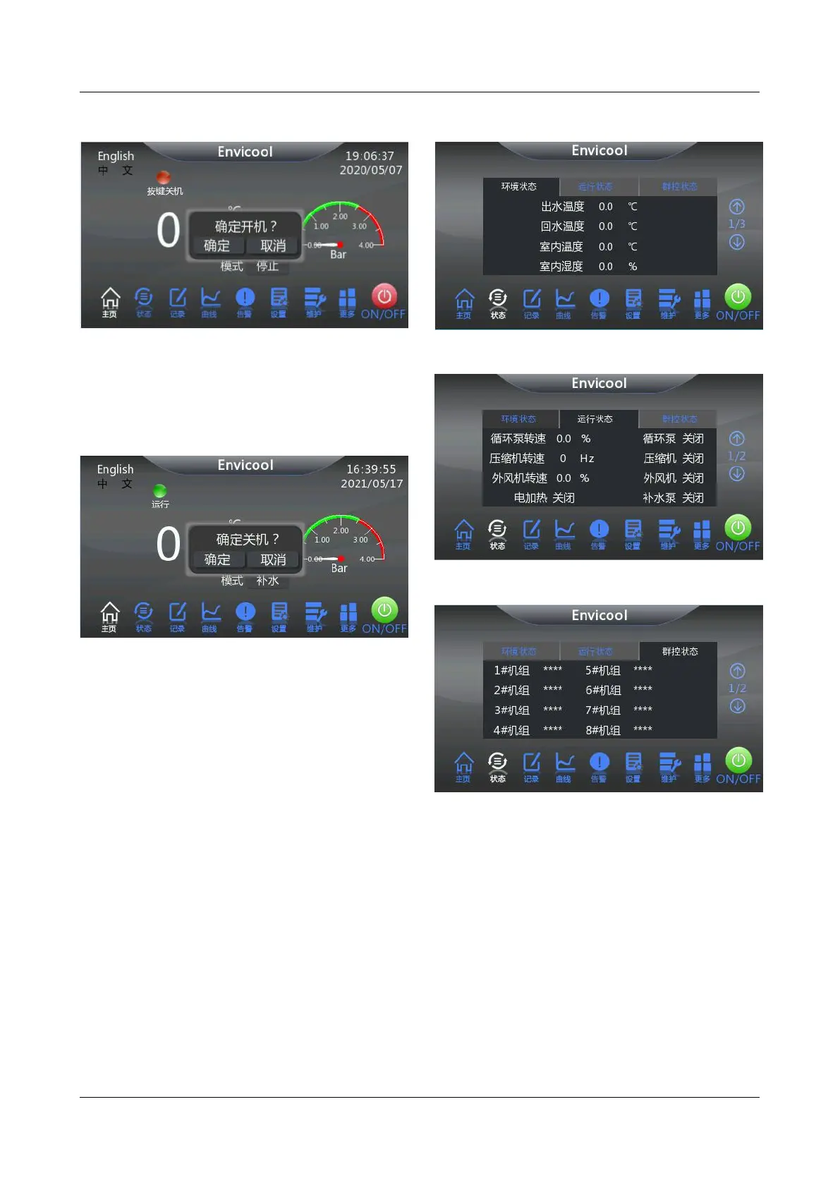 前的环境状态、运行状态和群控状态(选配)。