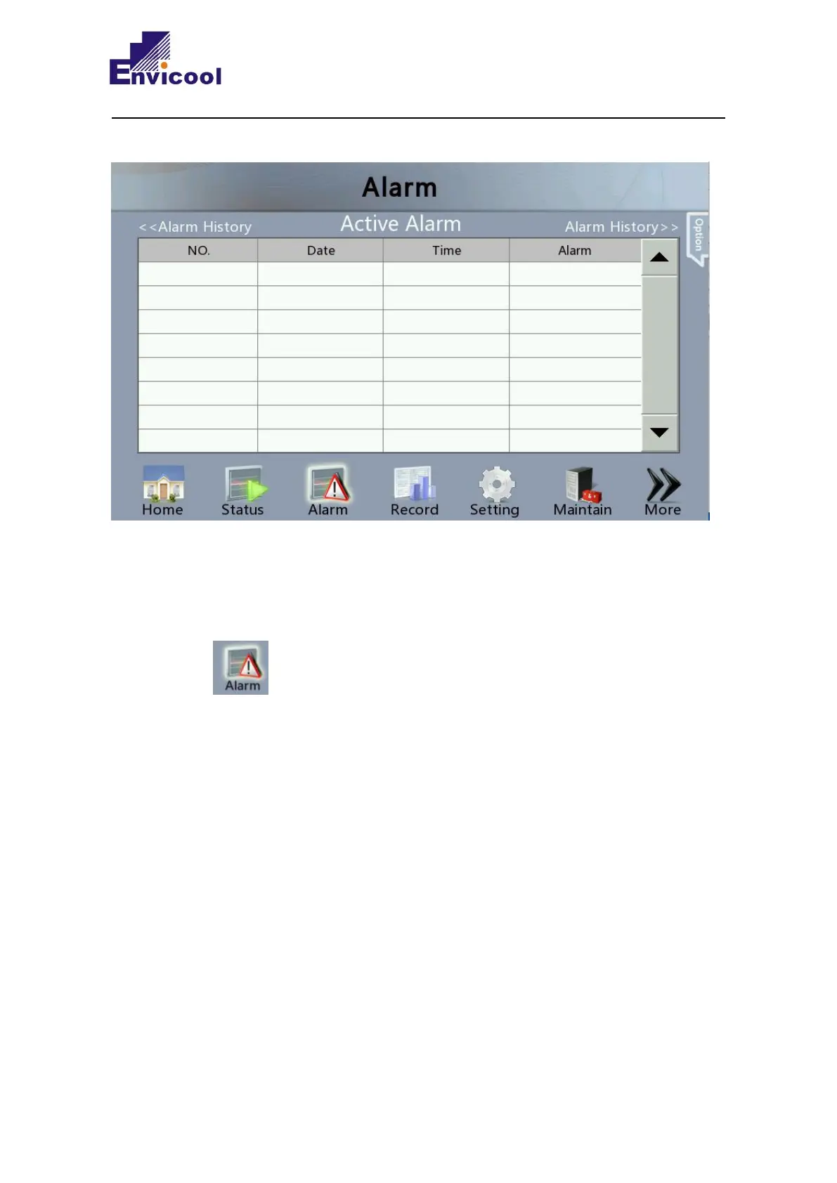 Click “ ” on any interface to enter Alarm interface.Click “Active Alarm” on the top of