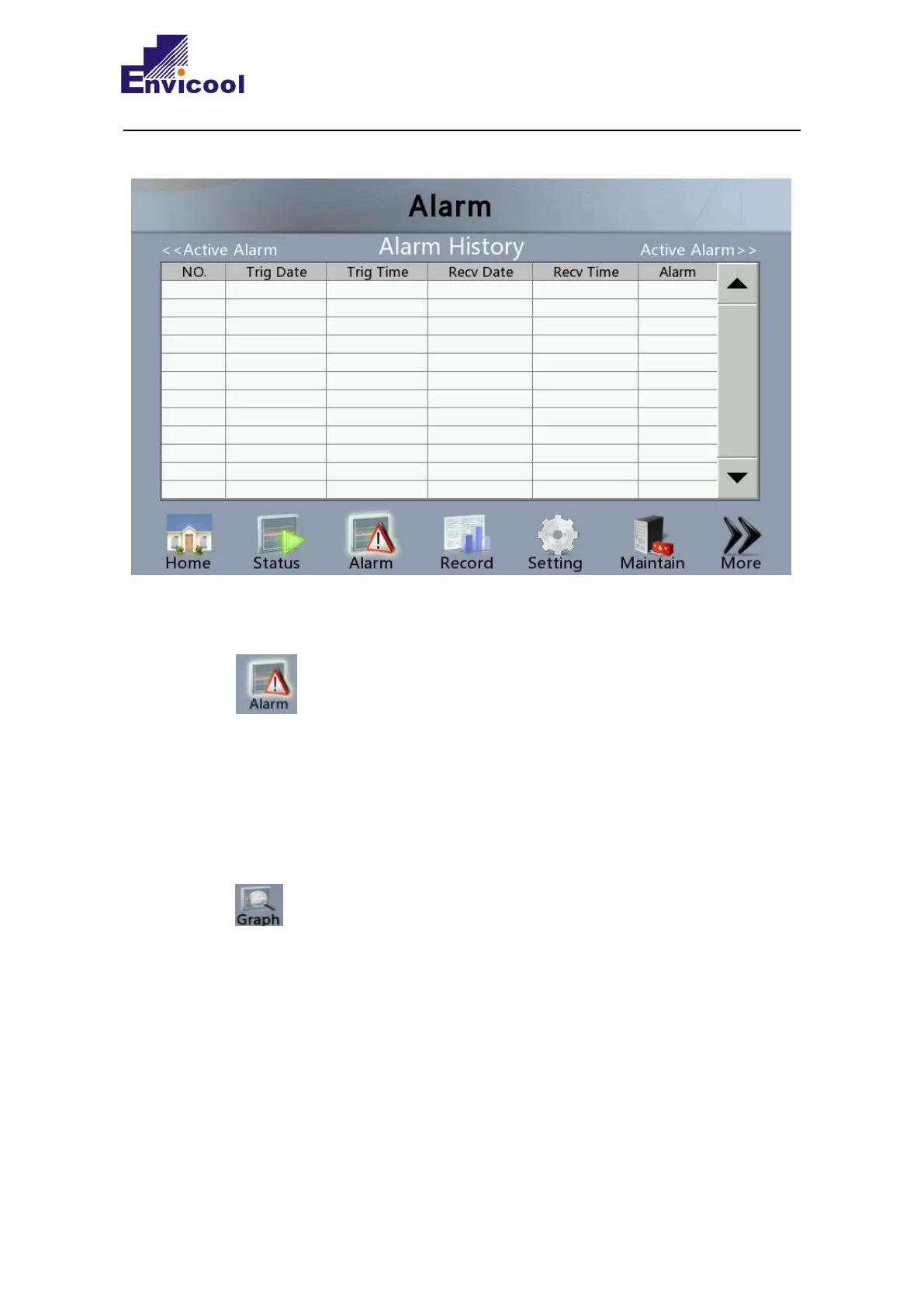 Click “ ” on any interface to enter Alarm interface.Click “Alarm History” on the top