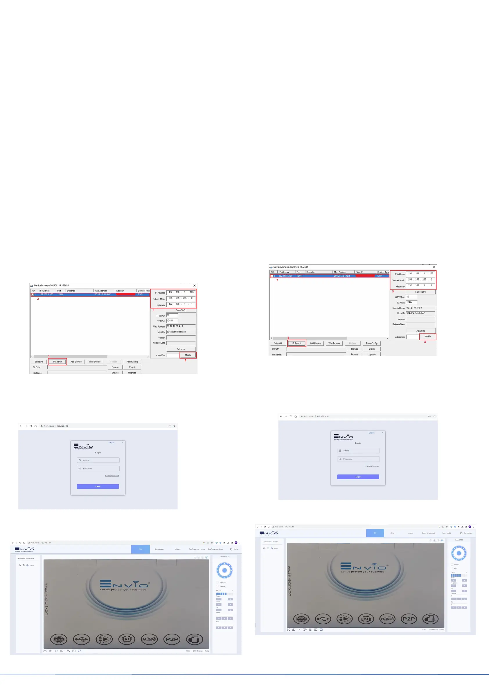 alimentare la telecamera in POE (IEEE.802.3af/3at). Scaricare dal sito www.enviosecurity.com , il software