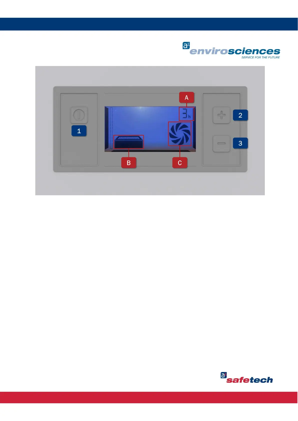 The display (A) shows the total running time of the filtration unit so far. Under certain