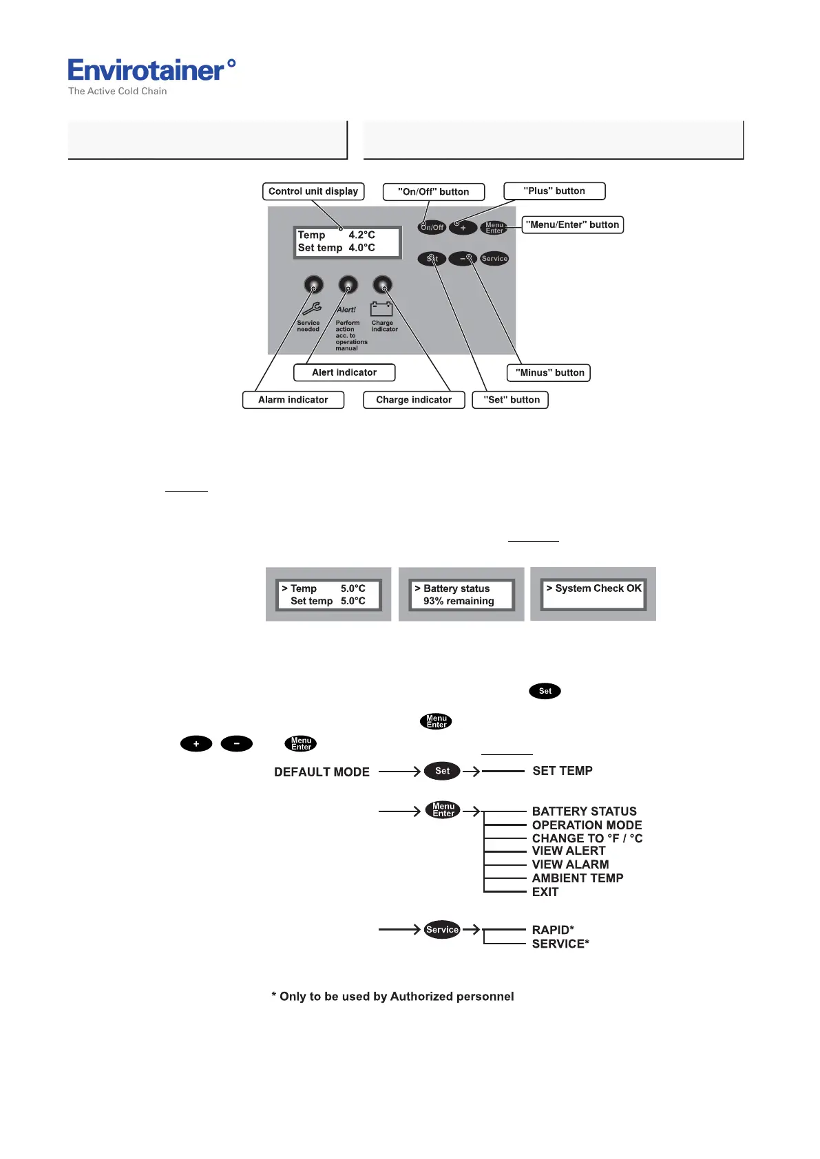 • The default mode toggles between showing "Temp X.X°C Set temp X.X°C", "Battery