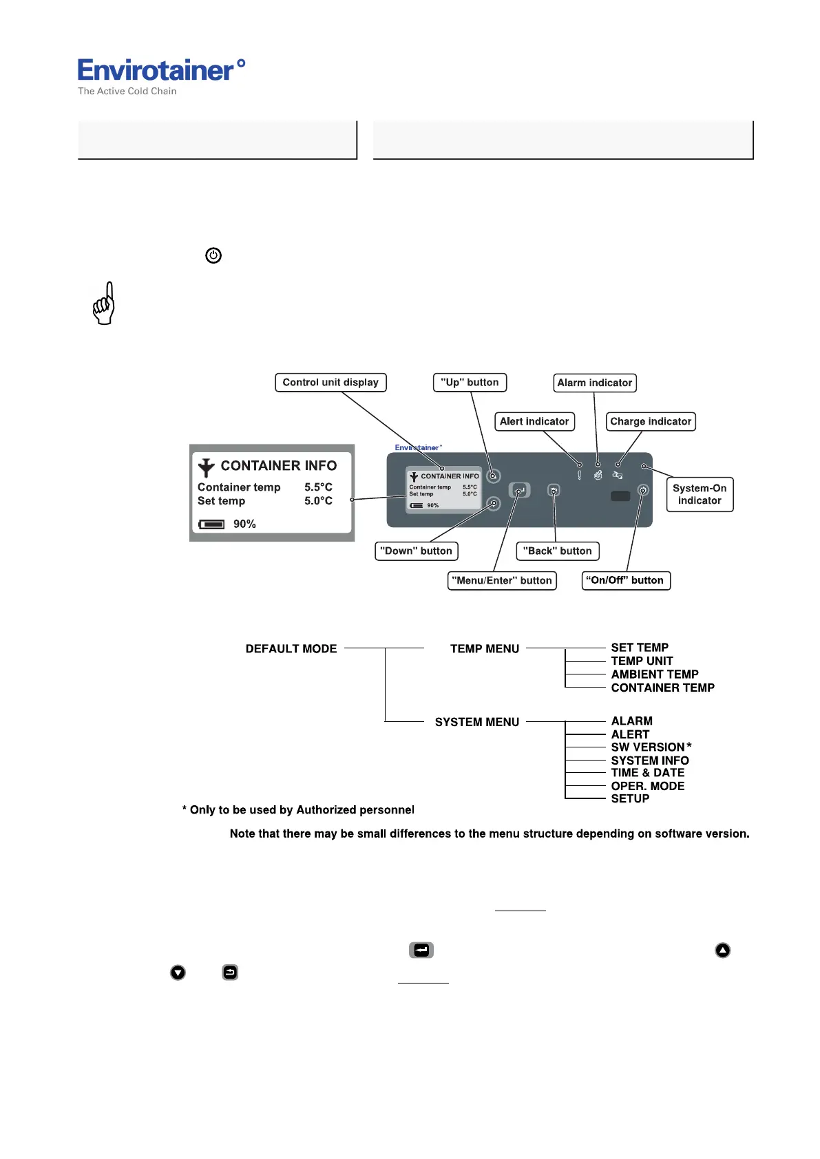 The default mode shows "Container temp", "Set temp" and battery status.