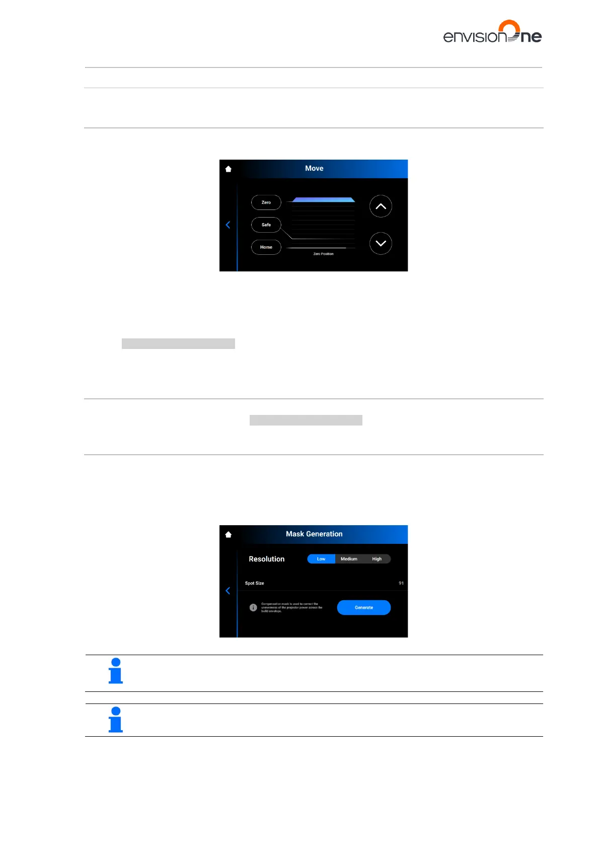 2. On the main screen of the Envision One Control Software, tap Settings | Move & Calibration | Mask