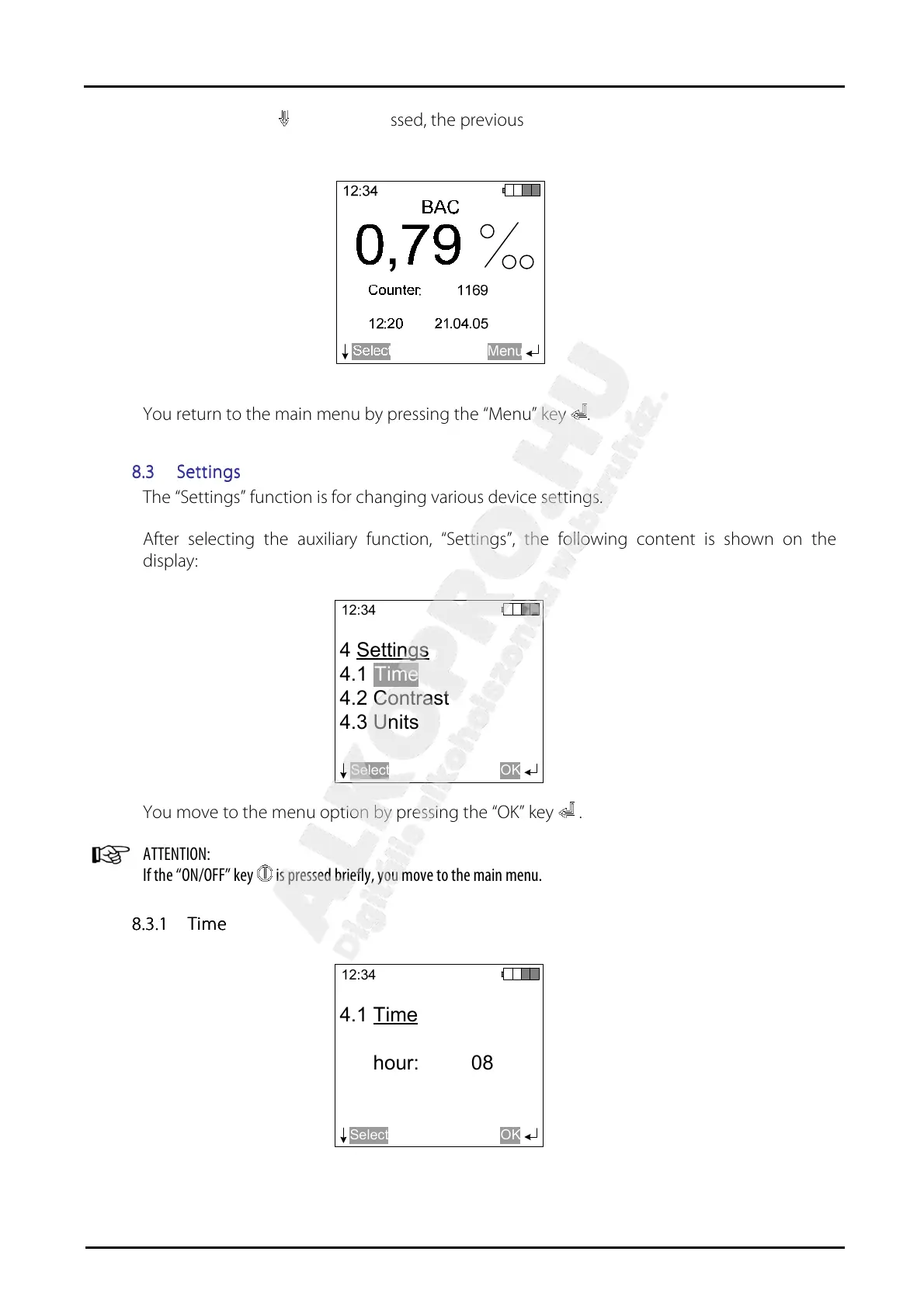 If the “ON/OFF” key is pressed briefly, you move to the main menu.