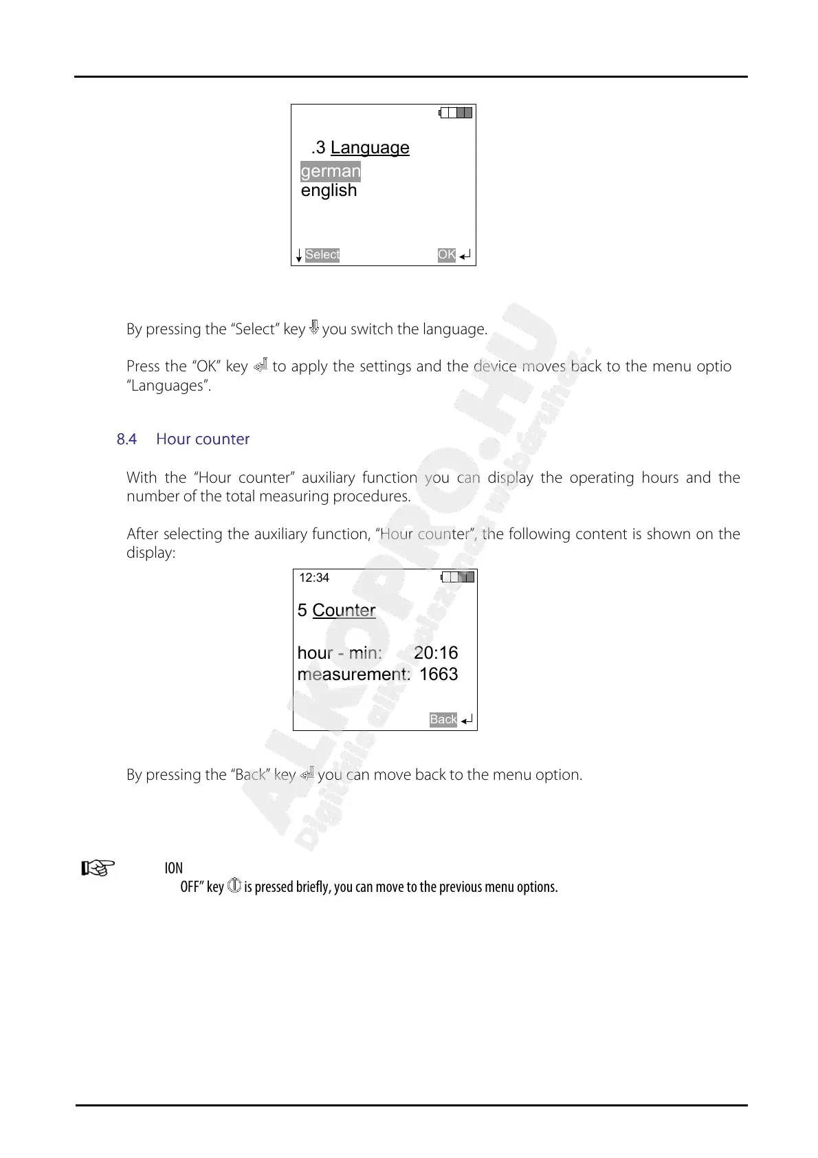 If the “ON/OFF” key is pressed briefly, you can move to the previous menu options.