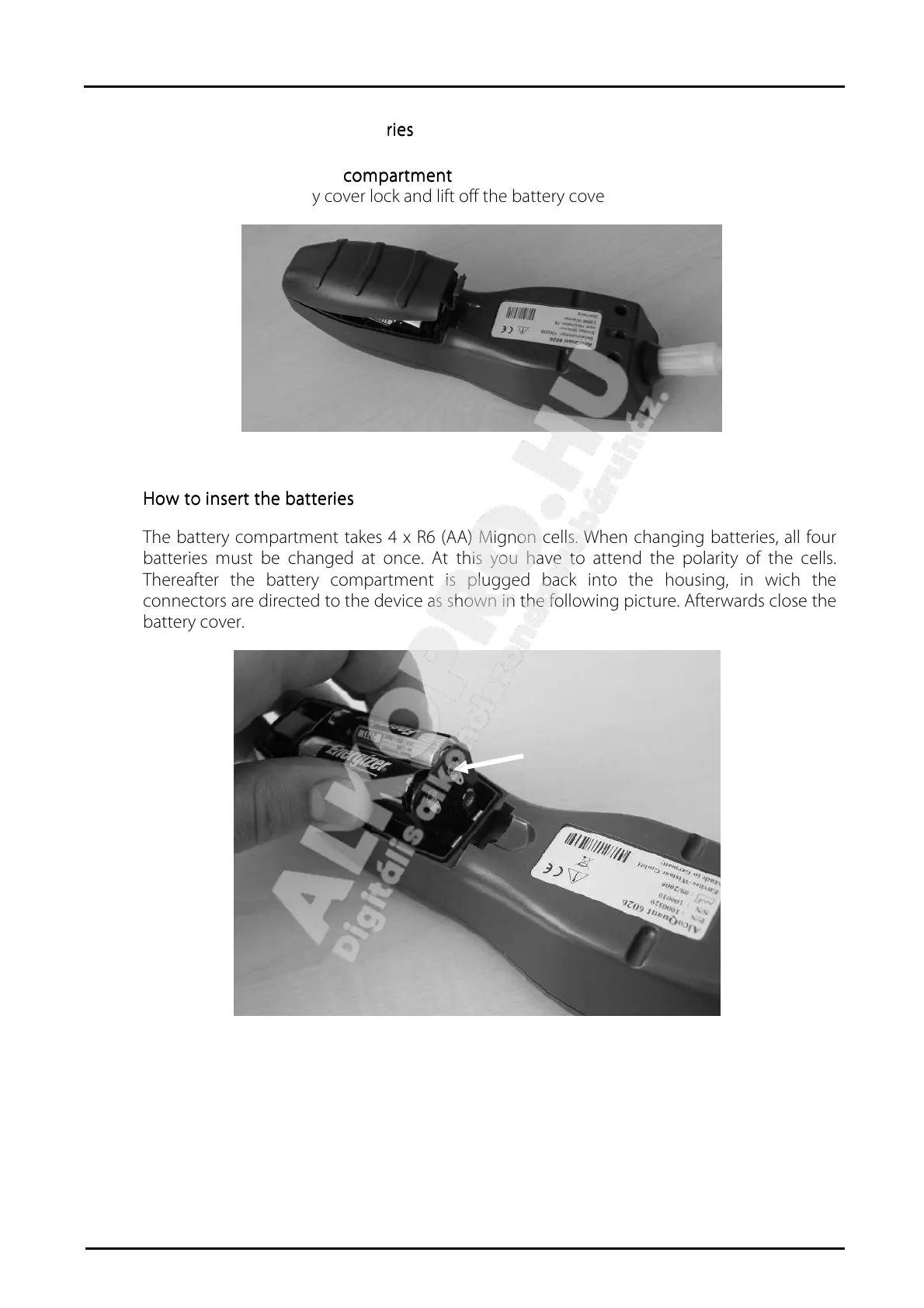 The battery compartment takes 4 x R6 (AA) Mignon cells. When changing batteries, all four