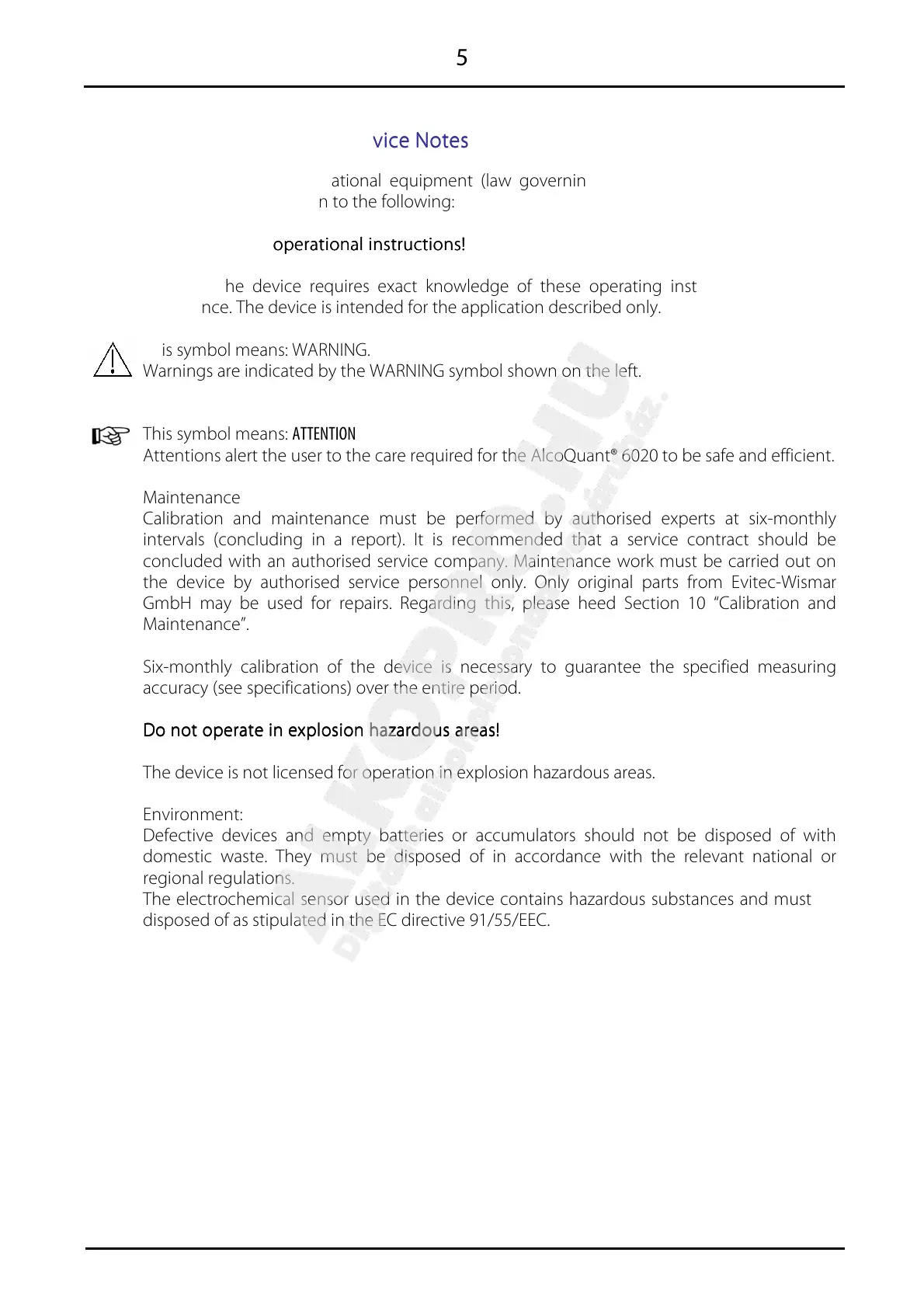 Attentions alert the user to the care required for the AlcoQuant® 6020 to be safe and efficient.