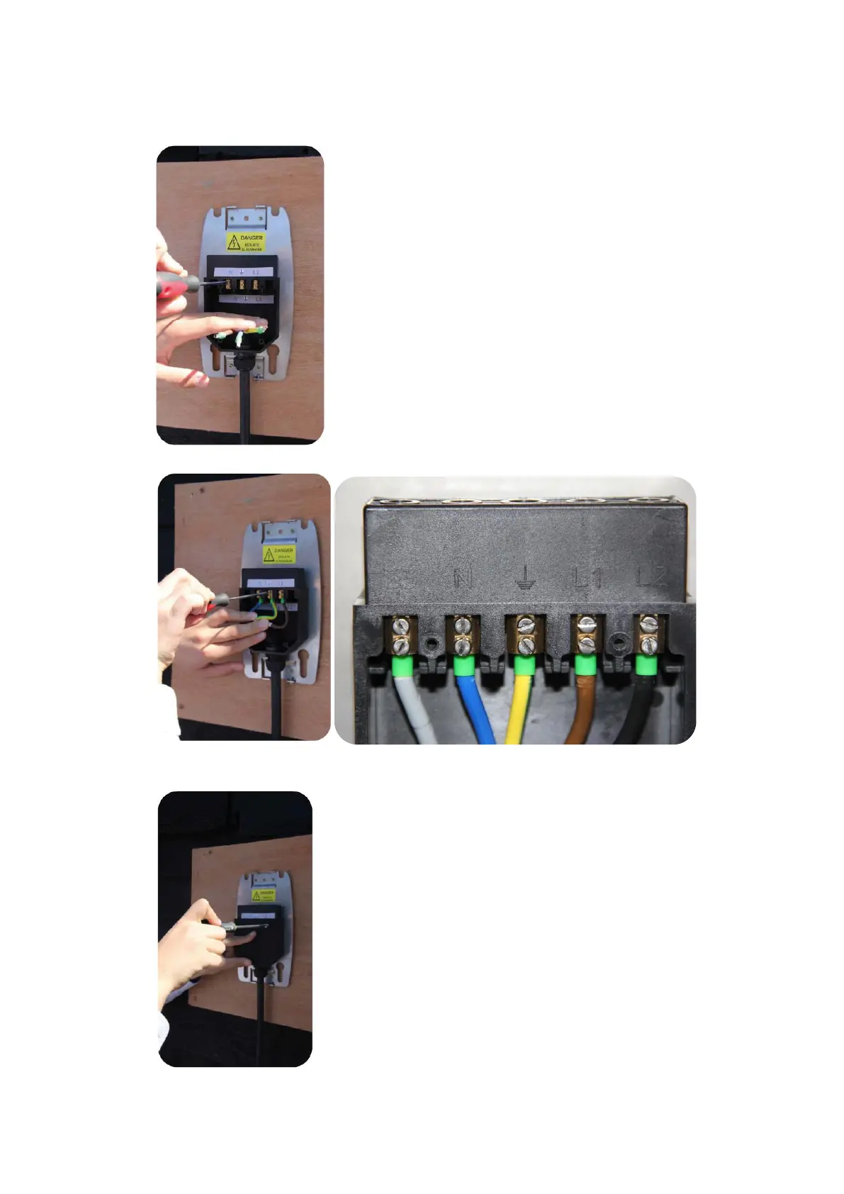 8) Connect the power cables to the pins as shown Single Phase or Three Phase