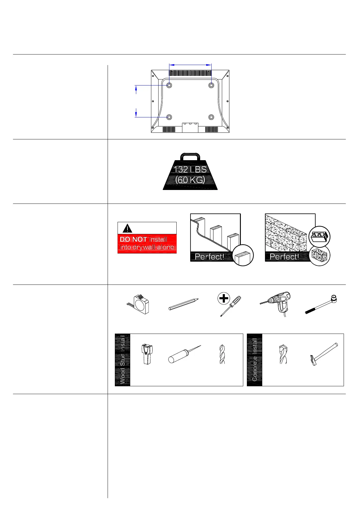 ● The wall must be capable of supporting five times the weight of the TV and mount
