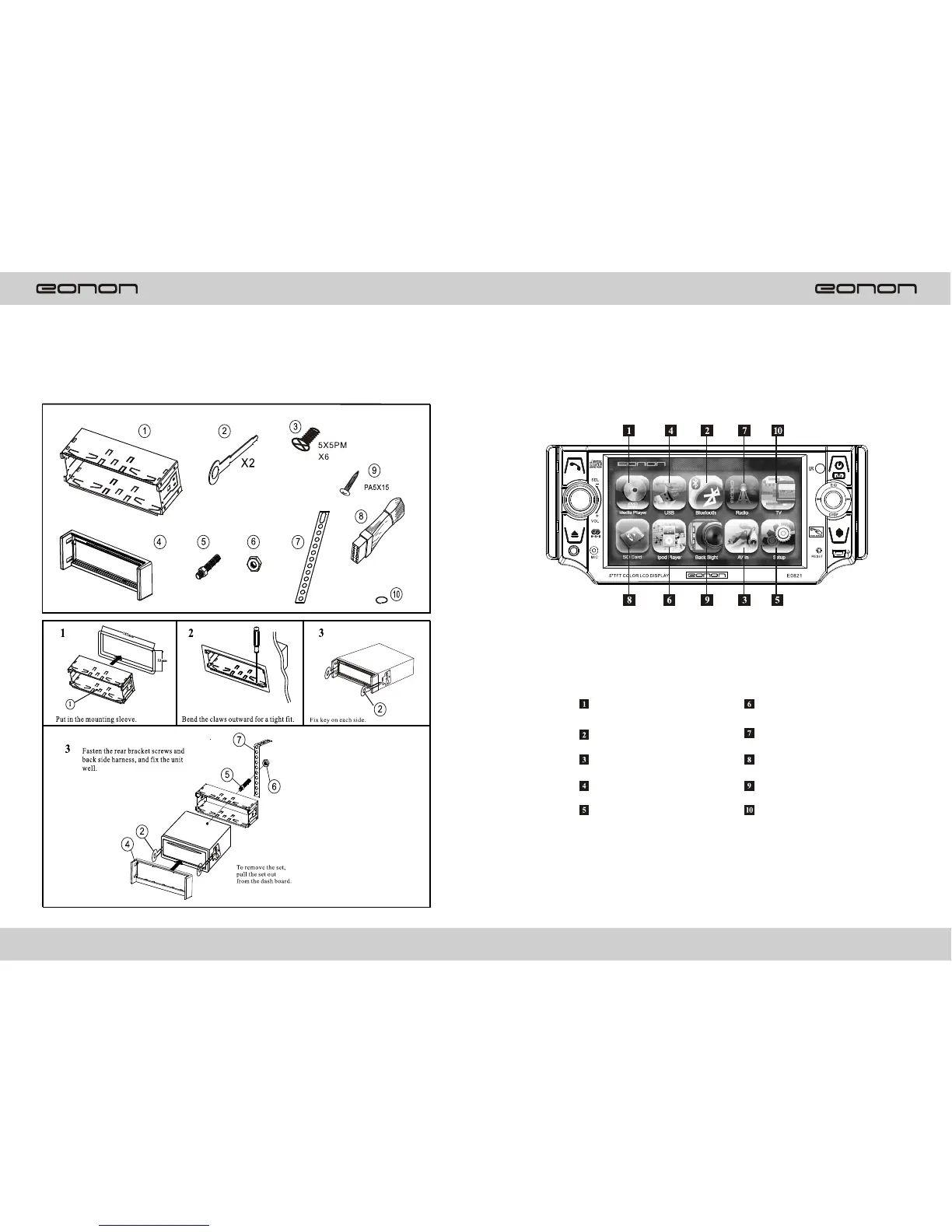 Eonon E0821 - Installation Parts and Steps; Installation Steps; Main Menu Functions