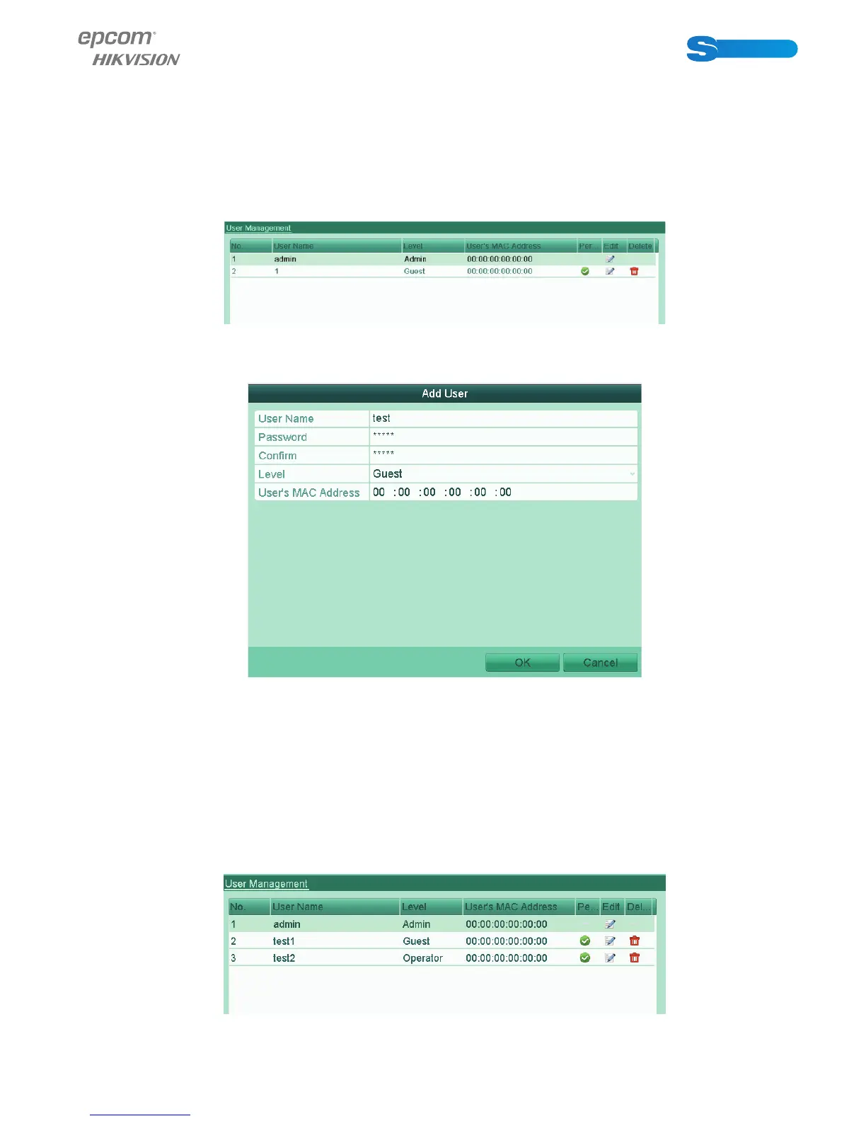 3. Enter the information for new user, including User Name, Password, Level and User’s MAC Address.