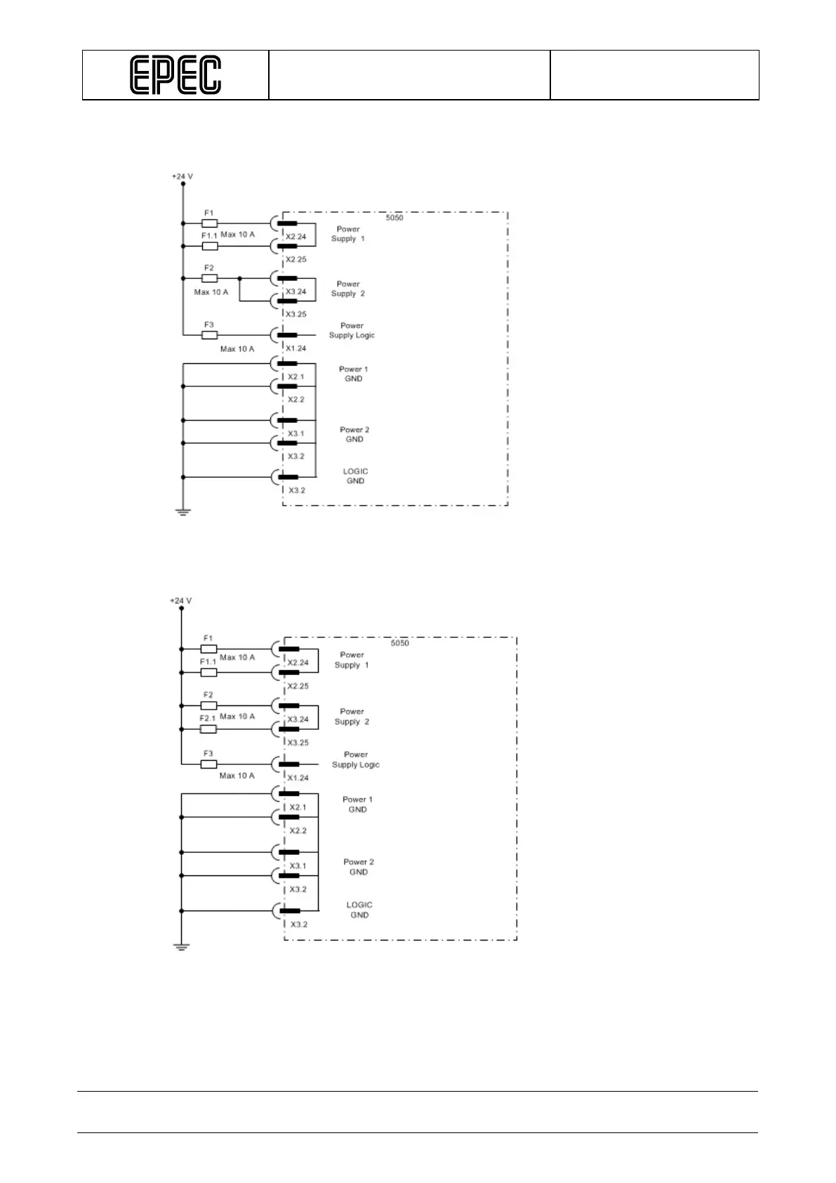 Power supply's wiring example when max 14 A is needed from Power 1 and max 10 A from