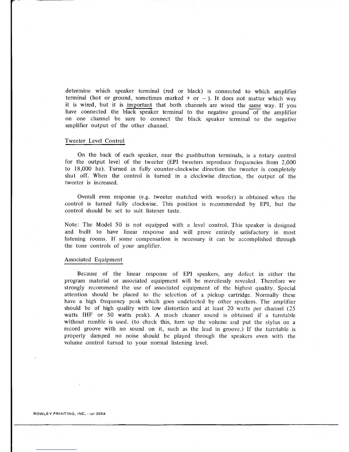 EPI 50 - Speaker Features and Operation; Tweeter Level Control Function; Model 50 Feature Note; Associated Equipment Recommendations