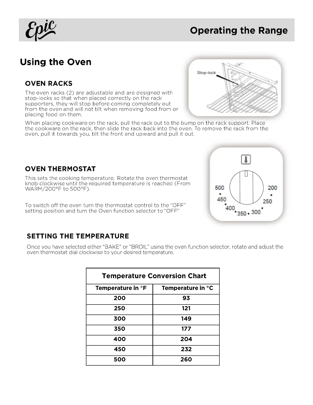 Epic EER239 - Oven Racks and Thermostat Operation; Temperature Conversion Chart