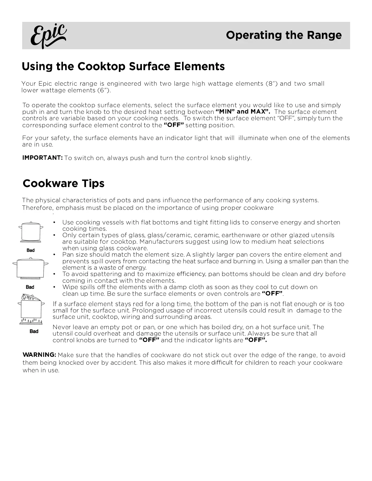 Epic EER239 - Using the Cooktop Surface Elements; Cookware Tips for Efficient Use
