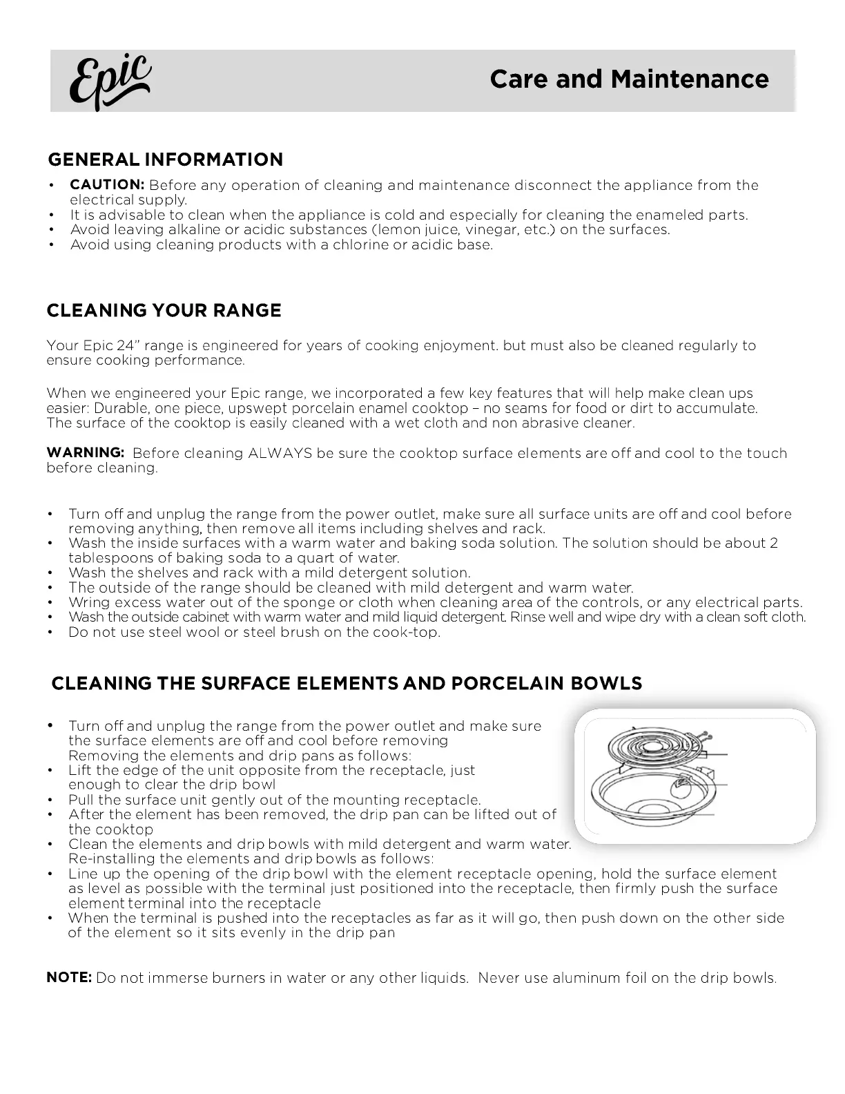 Epic EER239 - Care and Maintenance; General Cleaning Guidelines; Cleaning Surface Elements and Drip Bowls