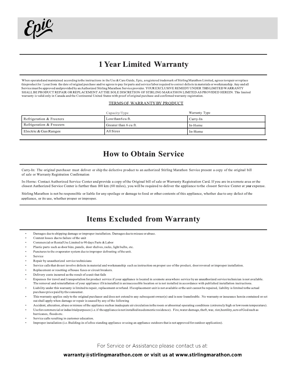 Epic EER239 - 1 Year Limited Warranty; How to Obtain Service or Assistance; Items Excluded from Warranty Coverage