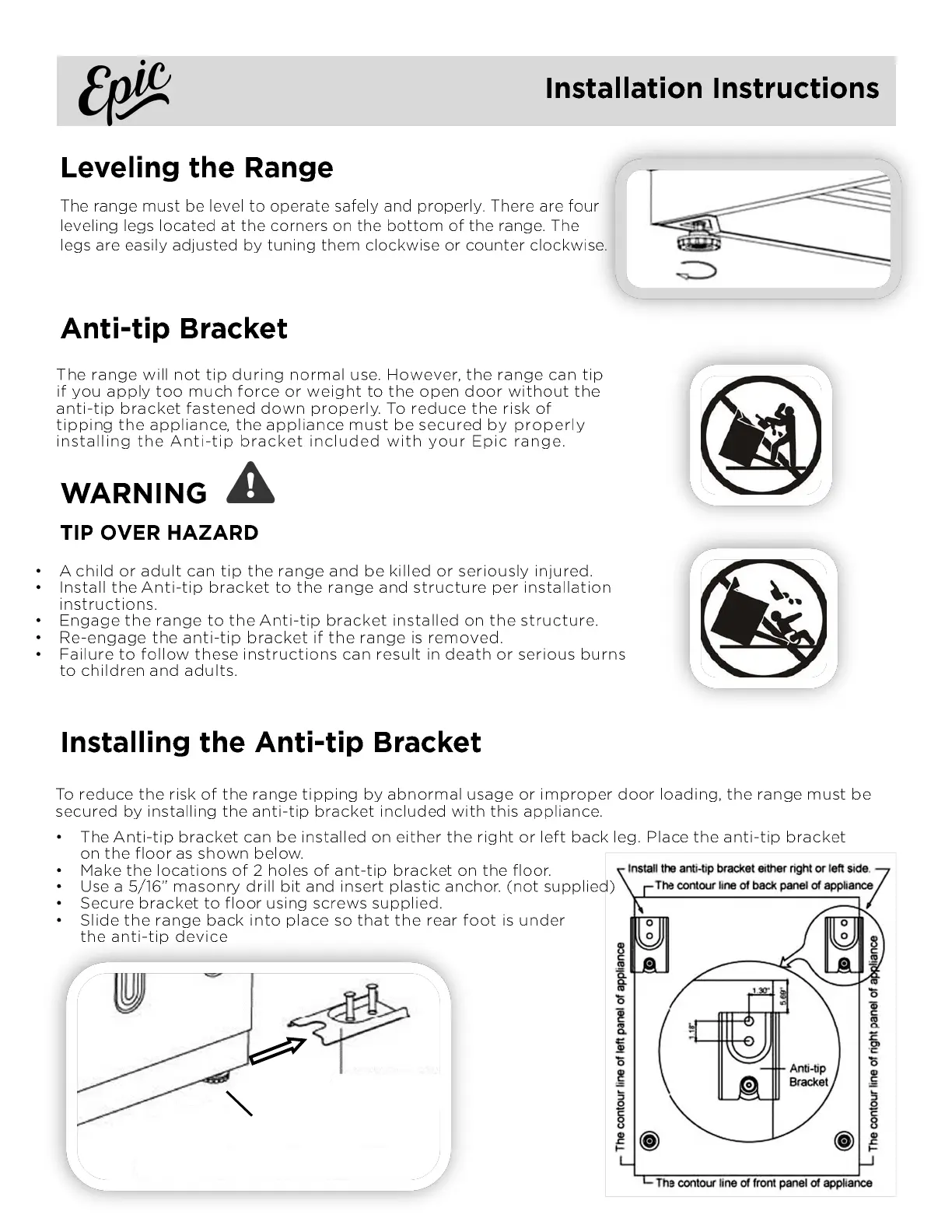 Epic EER239 - Leveling and Anti-Tip Bracket Installation; Leveling the Range; Anti-tip Bracket Installation