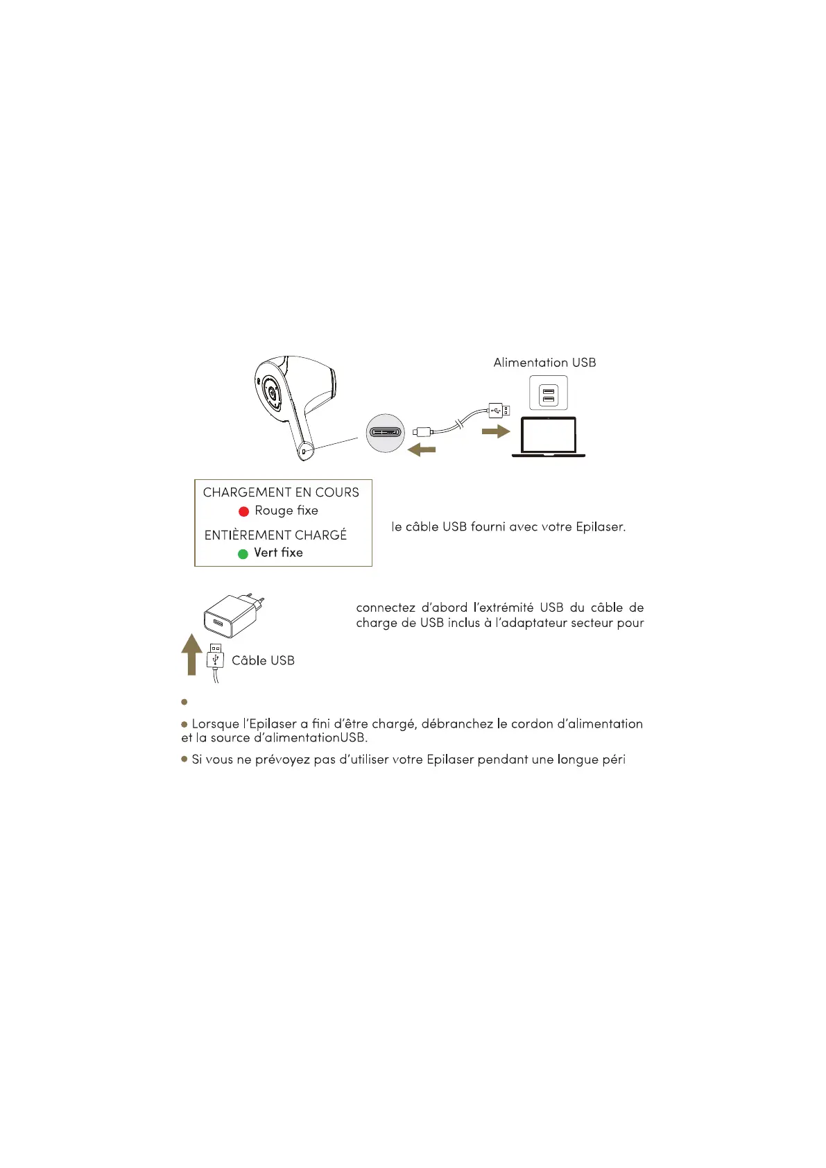 Il faut environ 3 heures pour charger complètement l’Epilaser.