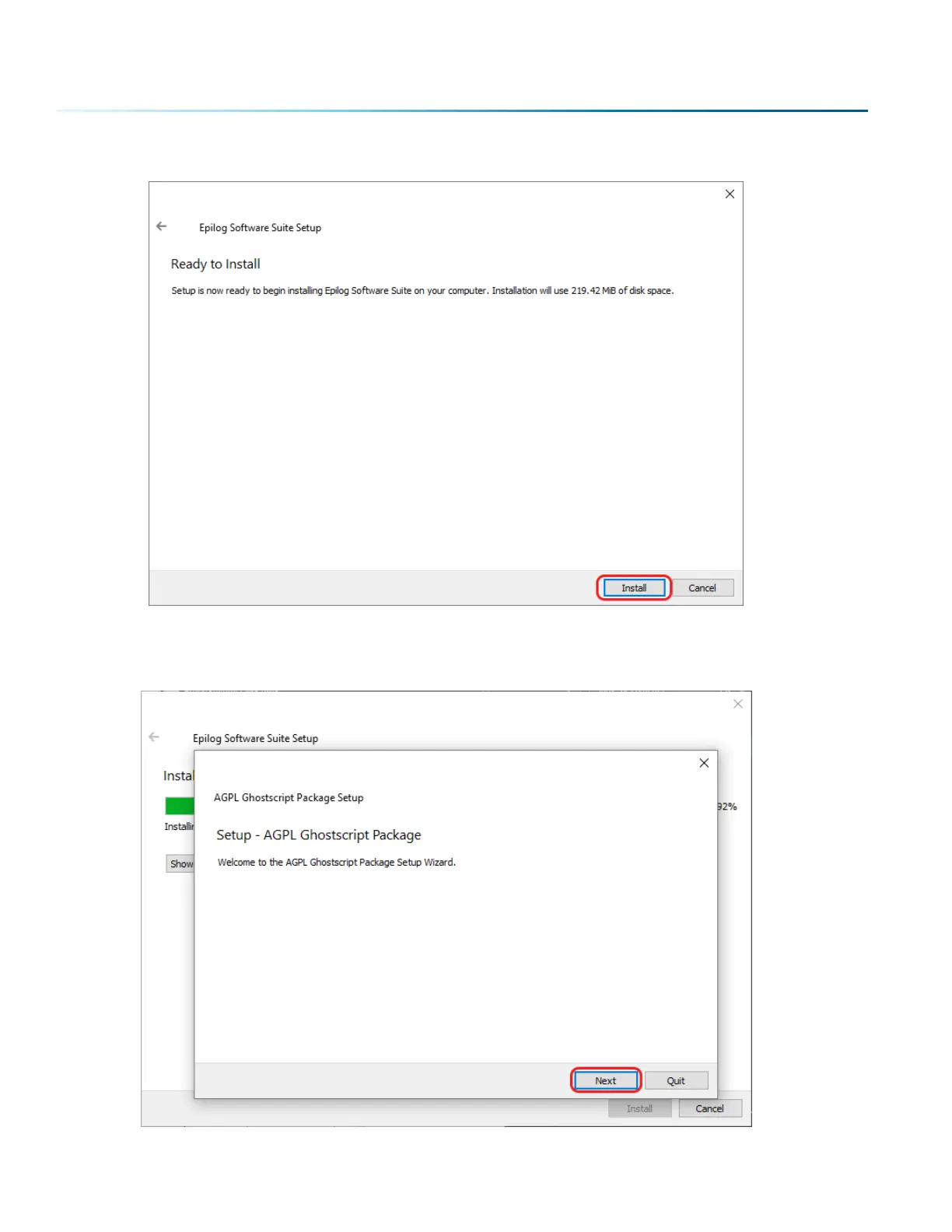8. The Epilog Soware Suite will begin installing, during the installation a dialog box will pop up to