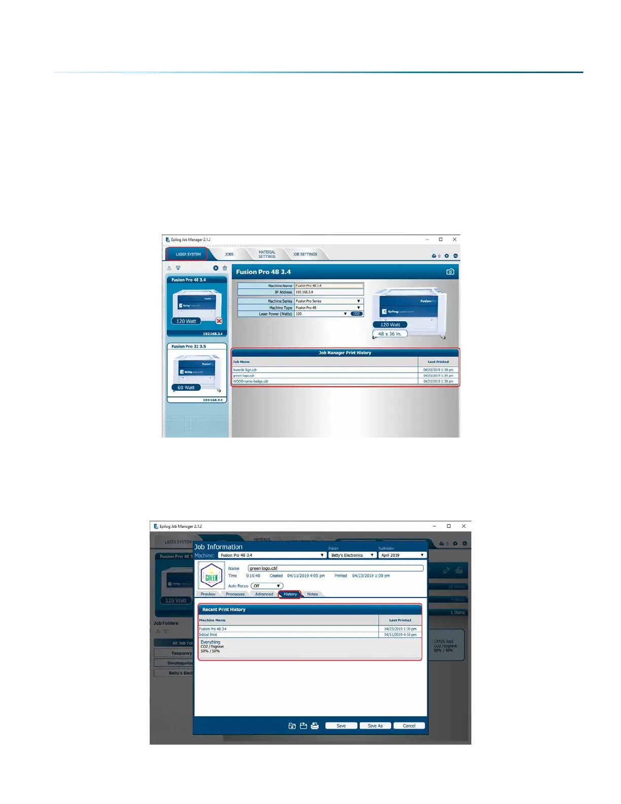 You can find the Job Manager Print History under the Laser System tab to see a full print history of a