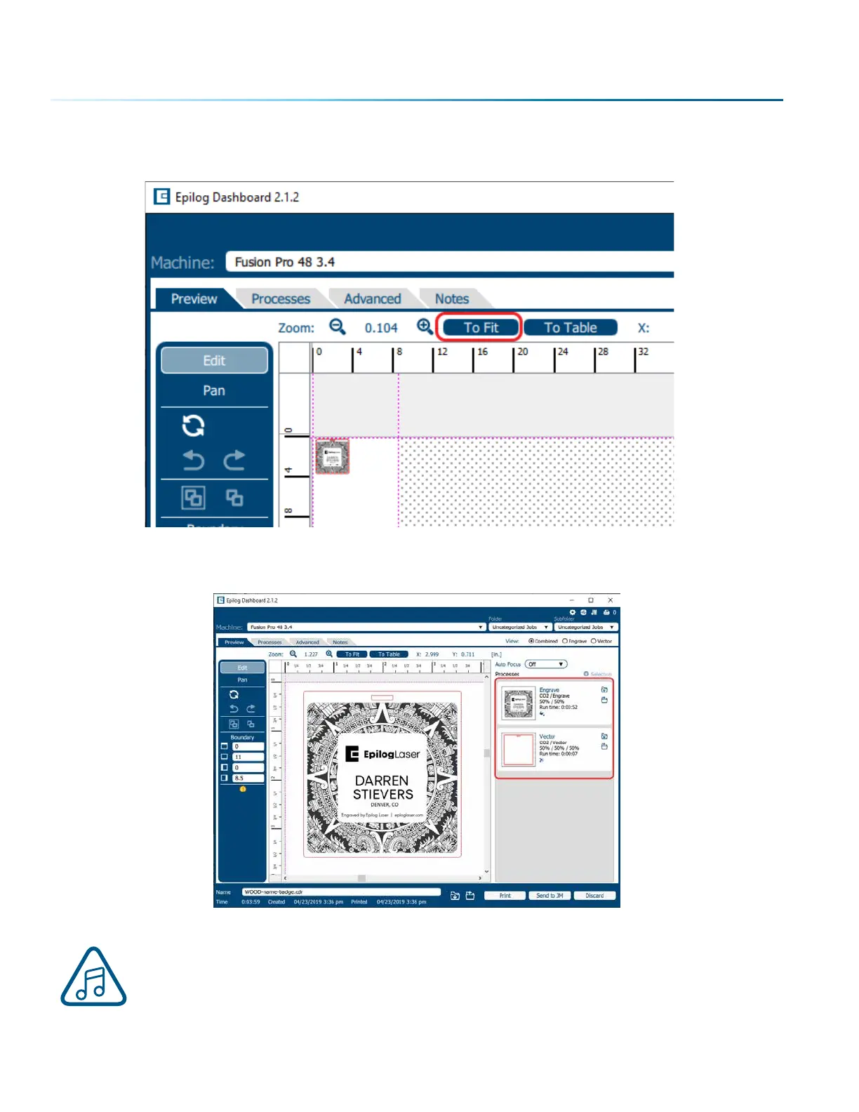3. Your file will open in the Laser Dashboard. Select “To Fit” to zoom in on your object.