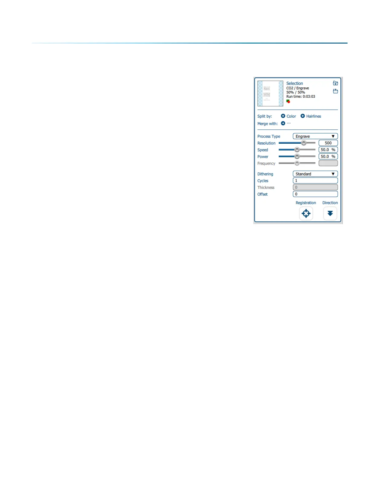 • Dithering / Vector Sort: The dithering drop-down will appear for Engrave processes, and Vector