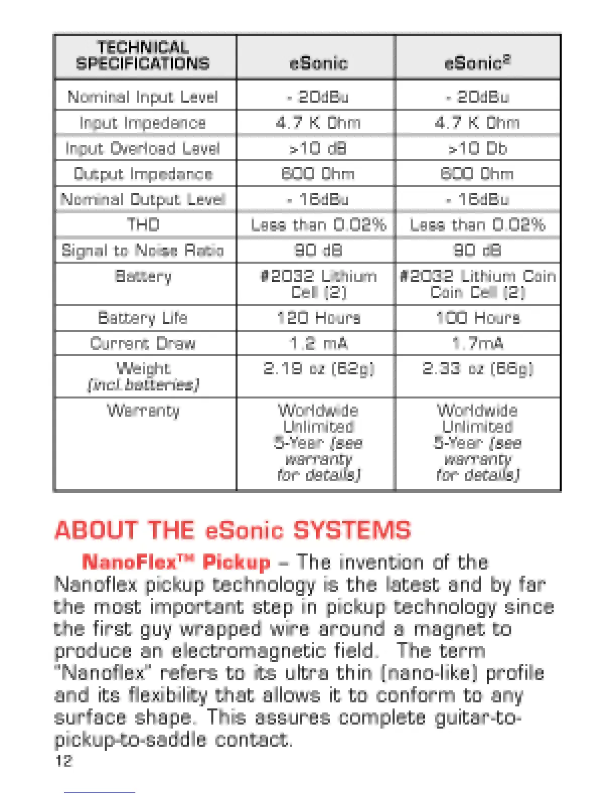 Epiphone eSonic - Technical Performance Metrics; Epiphone Pickup Technologies; Nanoflex Pickup Technology